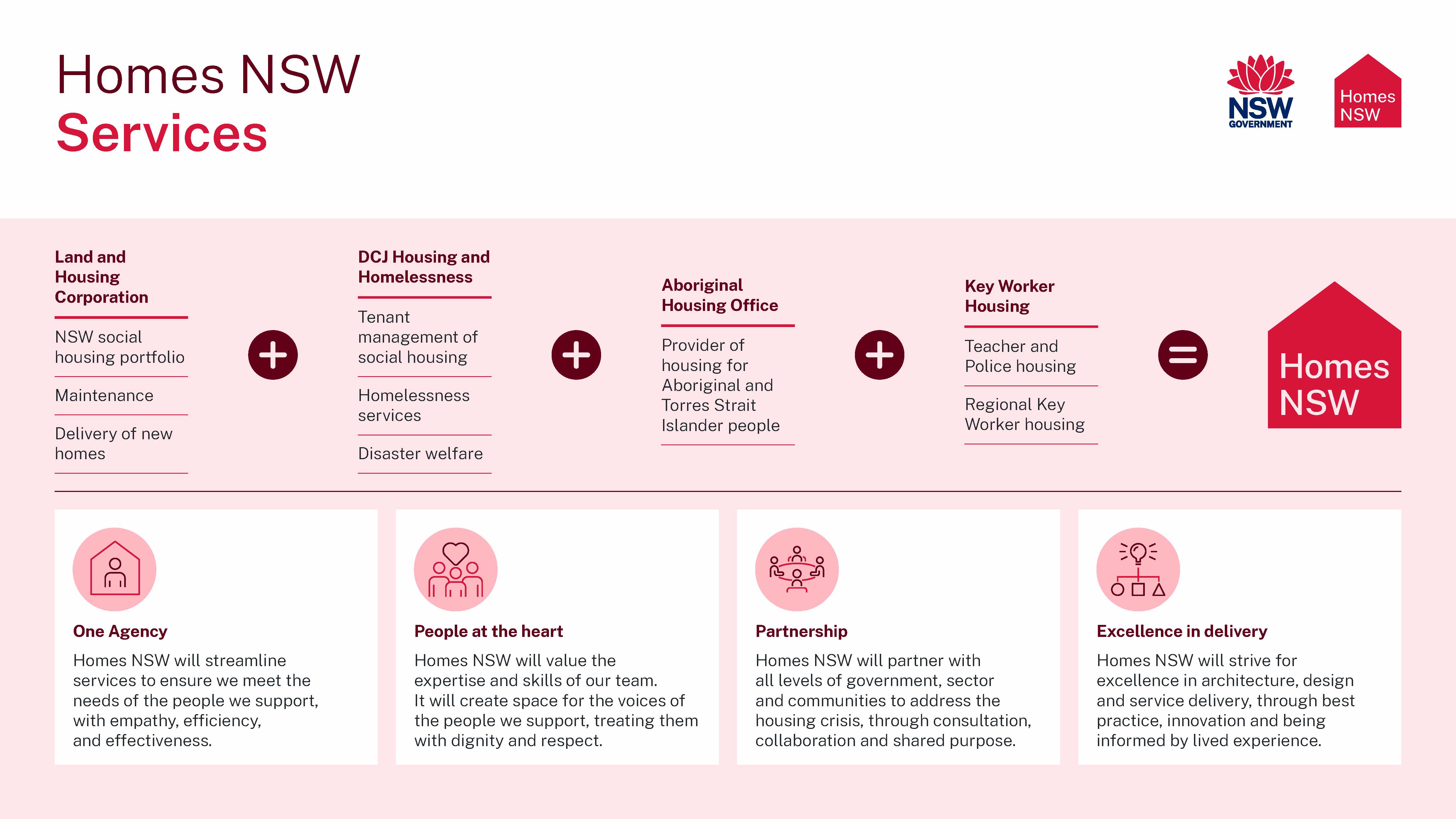 This Homes NSW Services diagram shows what makes up Homes NSW and how it proposes to deliver services.