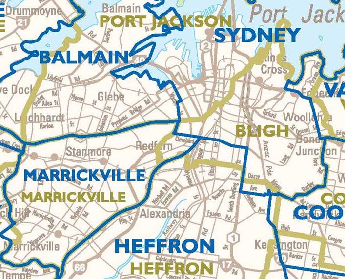 Changes to electoral boundaries in the REDW area for the next State election would see Clover Moore’s seat of Bligh move north of Cleveland Street and contain no part of Redfern Waterloo. Kristina Keneally’s seat of Heffron would move north to take in almost all of Redfern. The piece of Redfern on the Western side of the railway line, including the block, moves into Andrew Refshauge’s old seat of Marrickville. We have included the relevant section of the proposed boundary map below. (Proposed boundaries in blue & existing boundaries in gold). File size is 94Kb.
