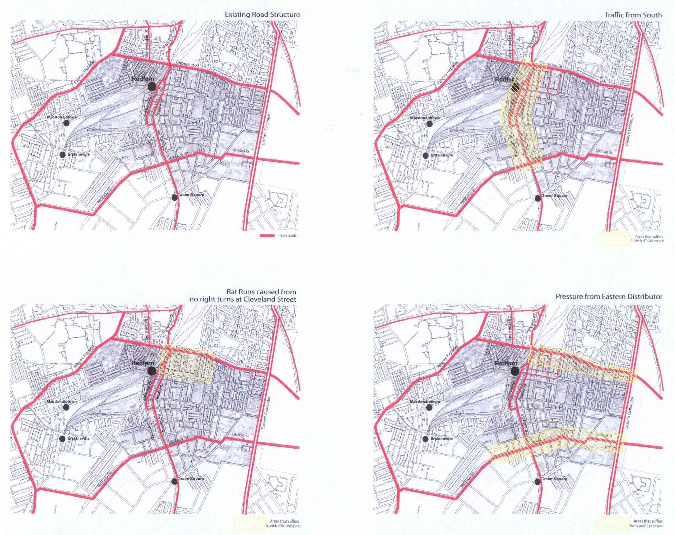 These maps show the regional traffic impacts on Redfern Waterloo identified by the RED Strategy Consultants. Source Slide 8 RED Strategy Consultation Overheads 25 June 2003. File size is 330 Kb.