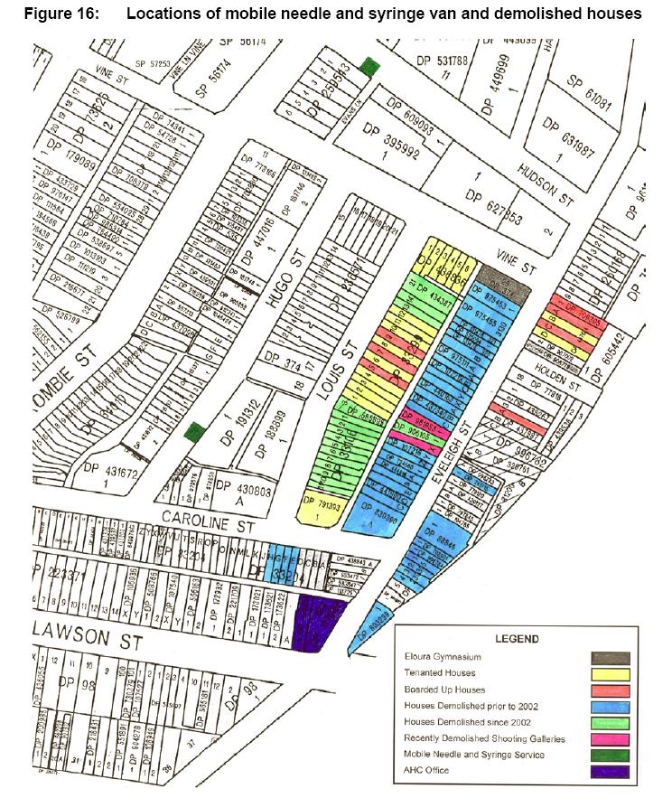 This map shows the location of houses demolished on The Block to early 2004. It also shows the locations used by the mobile needle van. This map is Figure 16 "Locations of mobile needle and syringe van and demolished houses" from the NSW Government Submission for the Inquiry into Redfern and Waterloo 30 April 2004. File size is 179 Kb.