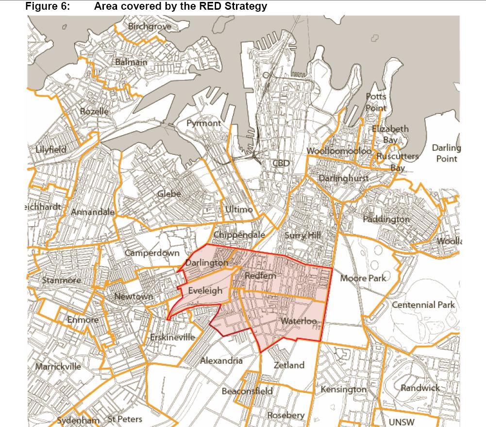 This shows the area initially covered by the RWPP RED Strategy. This map is Figure 6 "Area covered by the RED Strategy" from the NSW Government Submission for the Inquiry into Redfern and Waterloo 30 April 2004. File size is 209 Kb.