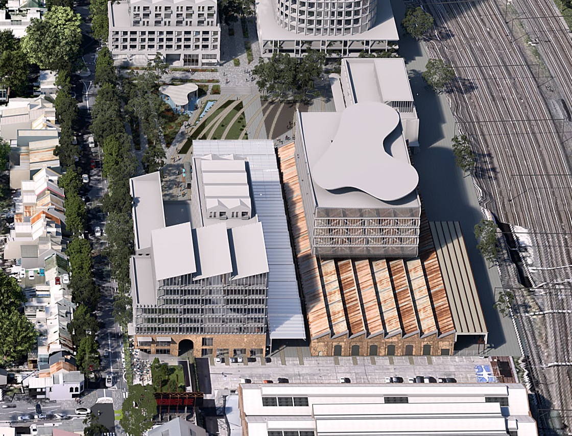 This image is extracted from an Aerial render of the proposed master plan on exhibition in August 2022. The image shows both the proposed building through the Paint Shop (which under the proposal can be anywhere over the building) as well as the replacement of part of the Paint Shop extension by a building onto Wilson Street and a battle-axe representation of the heritage Former Suburban Car Workshops building. To understand the importance of these buildings and what of heritage importance is impacted see the Heritage Significance summary for the Heritage Interpretation Strategy which REDWatch has extracted at http://www.redwatch.org.au/RWA/statesignificant/northeveleigh/TfNSW/paintshoprezone/220805hissig