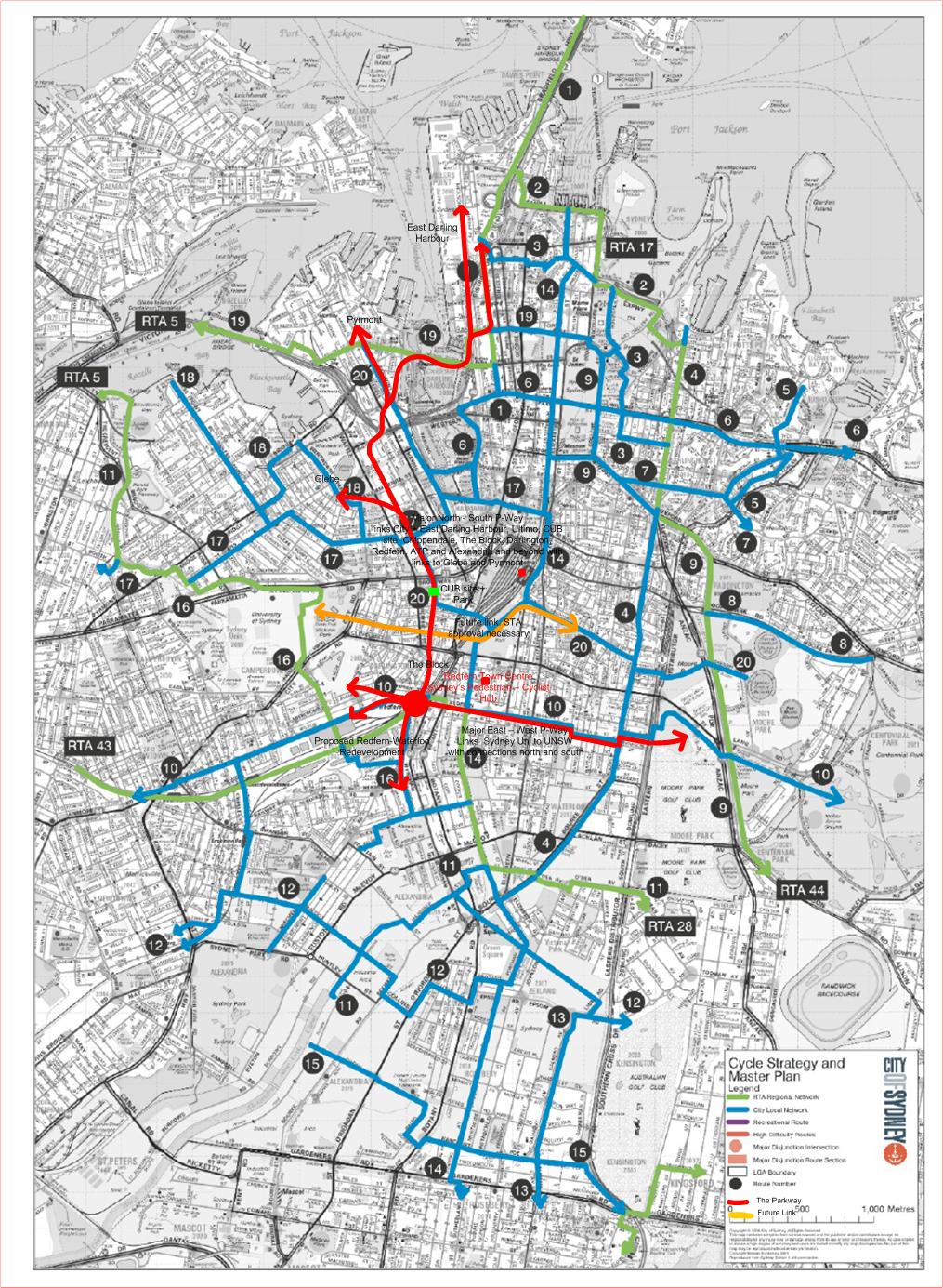 This is a copy of Council’s proposed Bike Masterplan – which is due to go on exhibition shortly for public comment. The green routes show RTA cycle paths, the blue routes show Council’s proposed cycle paths (to the year 2016). Here, Council’s plan shows the absence of routes locally, ie through Chippendale, Darlington and the Block. It should be noted the proposed cycle route via the CUB site to Prince Alfred Park is noted as a longer term option and is subject to STA approval. The concept plan for the Parkway is indicated in red, to allow comparison with the City’s proposal. Please note this plan is in the concept stage – finetuning may follow after feedback from various stakeholders including local communities and cycle groups. File is 366 Kb JPG.